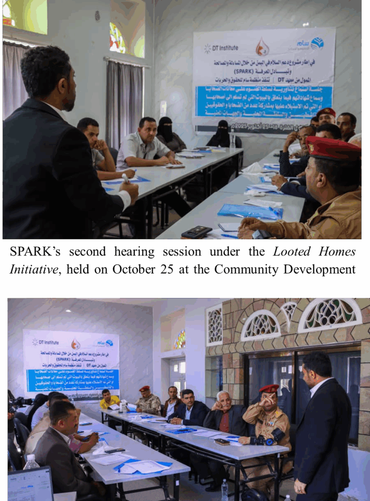 In the first hearing session, the SPARK facilitator utilized the report to draw attention to the hundreds of cases of looted homes throughout Taiz. These included cases where looted and eviction of rightful homeowners was conducted illegally and for no reason as the homes are located outside of conflict zones. The facilitator also highlighted the inaction and outright refusal of the authorities in many cases to enforce eviction orders.