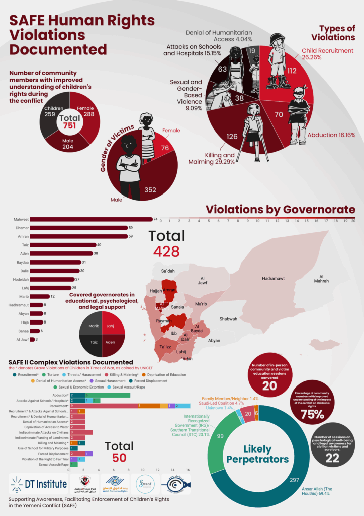 It is within this context that the SAFE Project was designed — to transform stories like Jennah’s from despair to justice. Over the past four years, DT Institute, in partnership with three local partners under SAFE – the Yemeni Coalition to Monitor Human Rights Violations (YCMHRV, also known as the Rasd Coalition), Watch for Human Rights (W4HR), and INSAF for Rights and Development – has implemented initiatives to address this growing crisis.