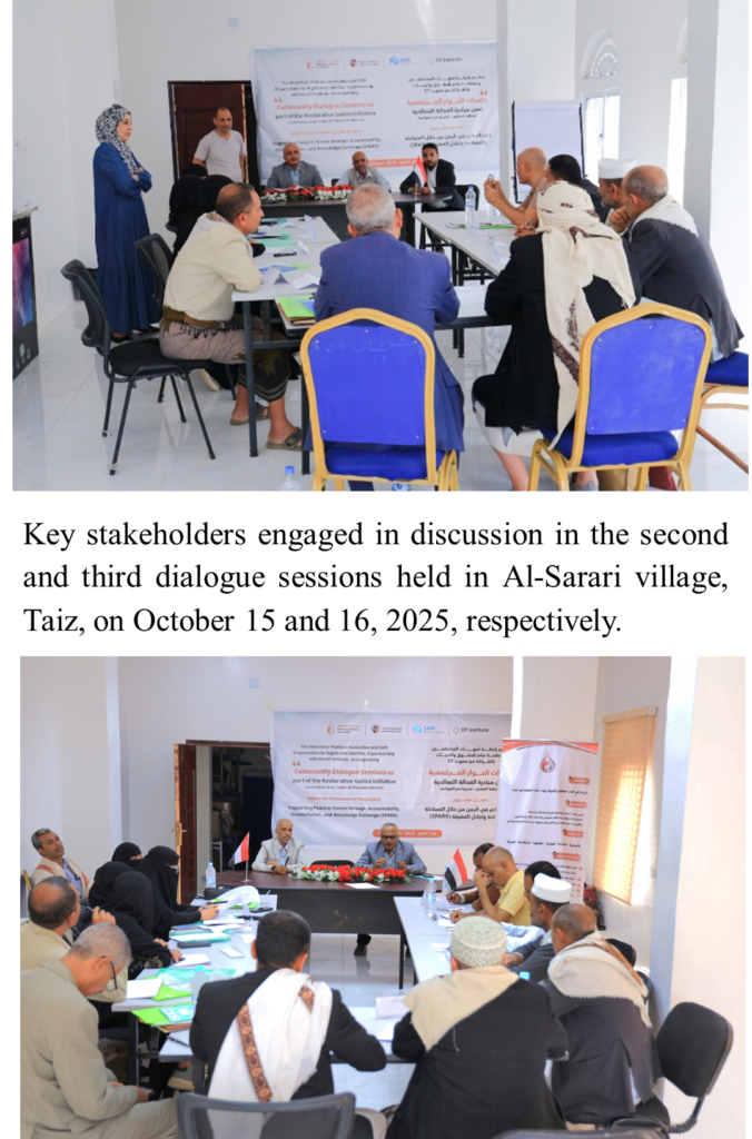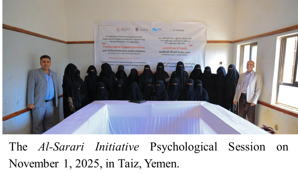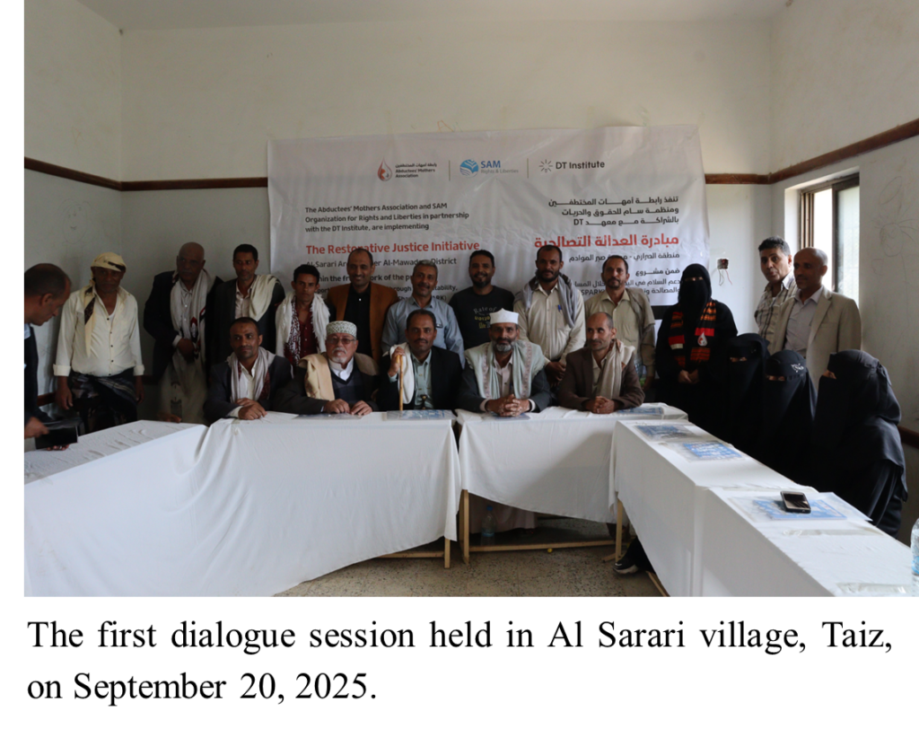 In July 2025, the SPARK team, composed of DT Institute and its local partners, the Abductees’ Mothers Association (AMA) and SAM for Rights and Liberties (SAM), launched the first restorative justice (RJ) pilot initiatives in Taiz. These initiatives aim to foster reconciliation and resolve community-level public disputes that have caused human rights violations.
